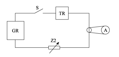 依據標準中對電氣防火限流保護器電氣性能測試的相關規定,短路限流測試電路如圖1所示,過負荷保護測試電路如圖2所示。圖1和圖2中的GR為電壓源、TR為被測試樣、S為單刀單擲開關、R為0.01Ω無感取樣電阻、CR為示波器、T為按鈕開關、Z1為3~6A阻性負載,圖2中A為鉗式電流表、Z2為25~50A阻性負載。