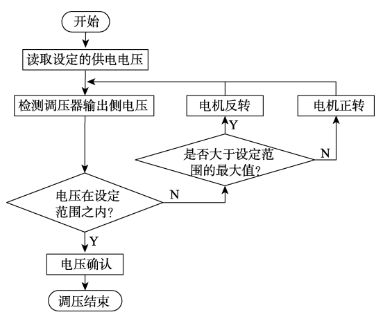 測試裝置供電程序流程圖如圖7所示。在對電氣防火限流保護器進行電壓波動測試時,調壓器輸出側需要提供187V和242V電壓;在進行短路限流測試和過負荷保護測試時,調壓器輸出側需要提供220V電壓。在測試軟件界面選定供電電壓之后,軟件通過電壓檢測模塊實時讀取調壓器輸出側的電壓有效值,并判斷其是否在設定的電壓范圍之內,若在范圍之內,則調壓結束;反之,繼續進行調整,判斷其是否大于設定范圍的較大值。若大于,則使步進電機反轉,減小調壓器輸出側電壓;反之,使步進電機正轉,增大調壓器輸出側電壓。重復上述操作,直至調壓器輸出側電壓調整到設定范圍之內,保證供電電壓的準確性。