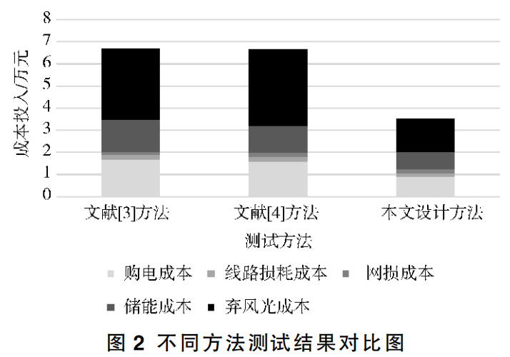 不同控制方法下測(cè)試風(fēng)光接入微電網(wǎng)系統(tǒng)的累計(jì)成本投入情況如圖2所示。可以看出,在3種不同測(cè)試方法下,測(cè)試風(fēng)光接入微電網(wǎng)系統(tǒng)的累計(jì)成本投入情況表現(xiàn)出較為明顯的差異。其中,線路損耗成本、網(wǎng)損成本基本一致,并未出現(xiàn)明顯的不同,但購(gòu)電成本、儲(chǔ)能成本以及棄風(fēng)光成本的差值明顯較大。