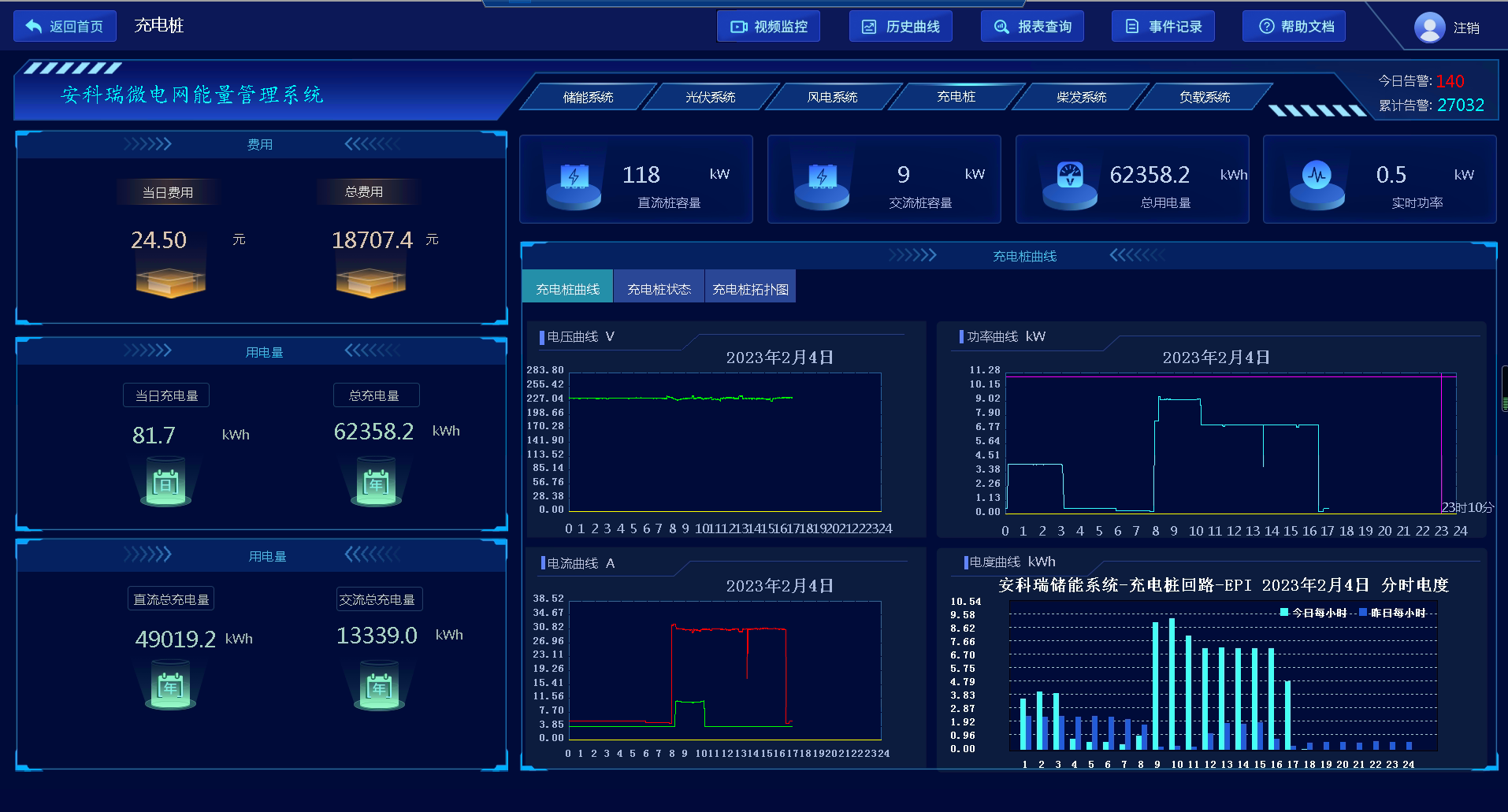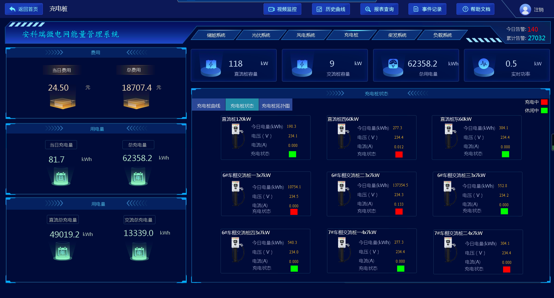 本界面用來(lái)展示對(duì)充電樁系統(tǒng)信息,主要包括充電樁用電總功率、交直流充電樁的功率、電量、電量費(fèi)用,變化曲線、各個(gè)充電樁的運(yùn)行數(shù)據(jù)等。