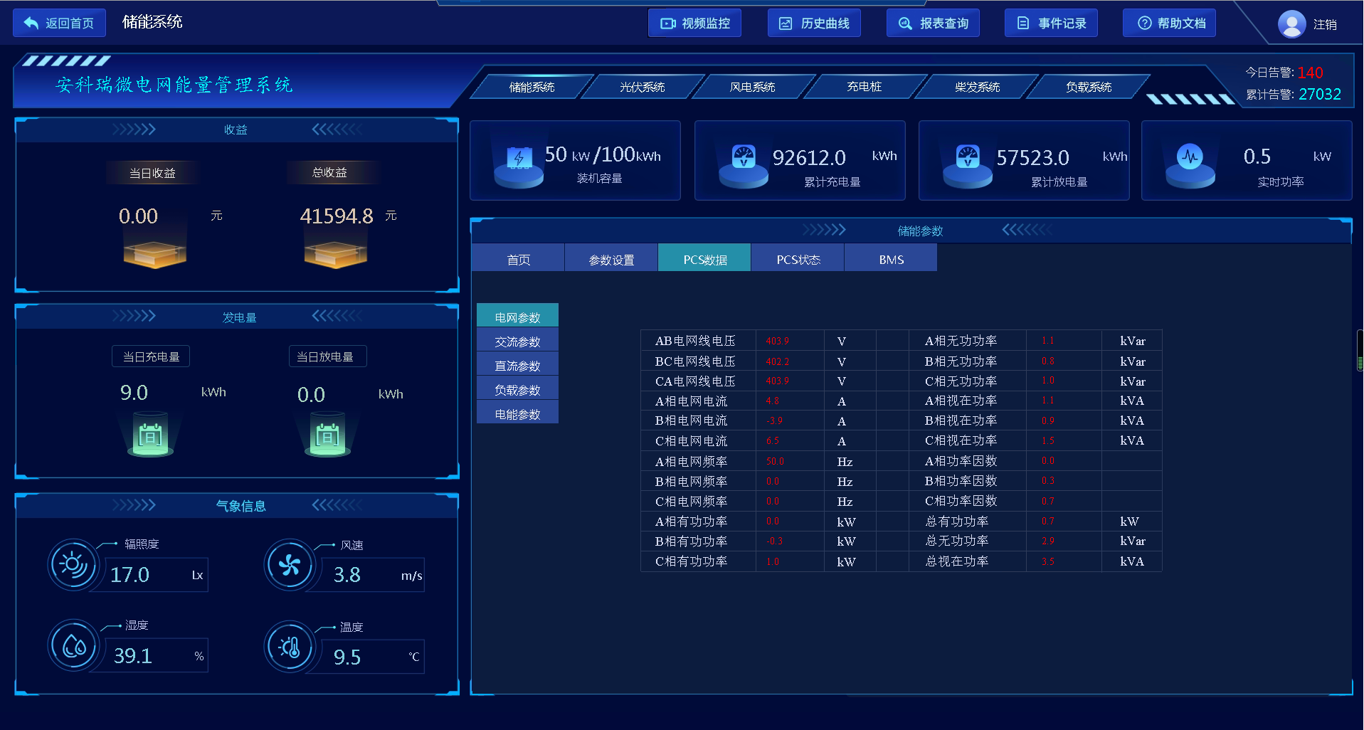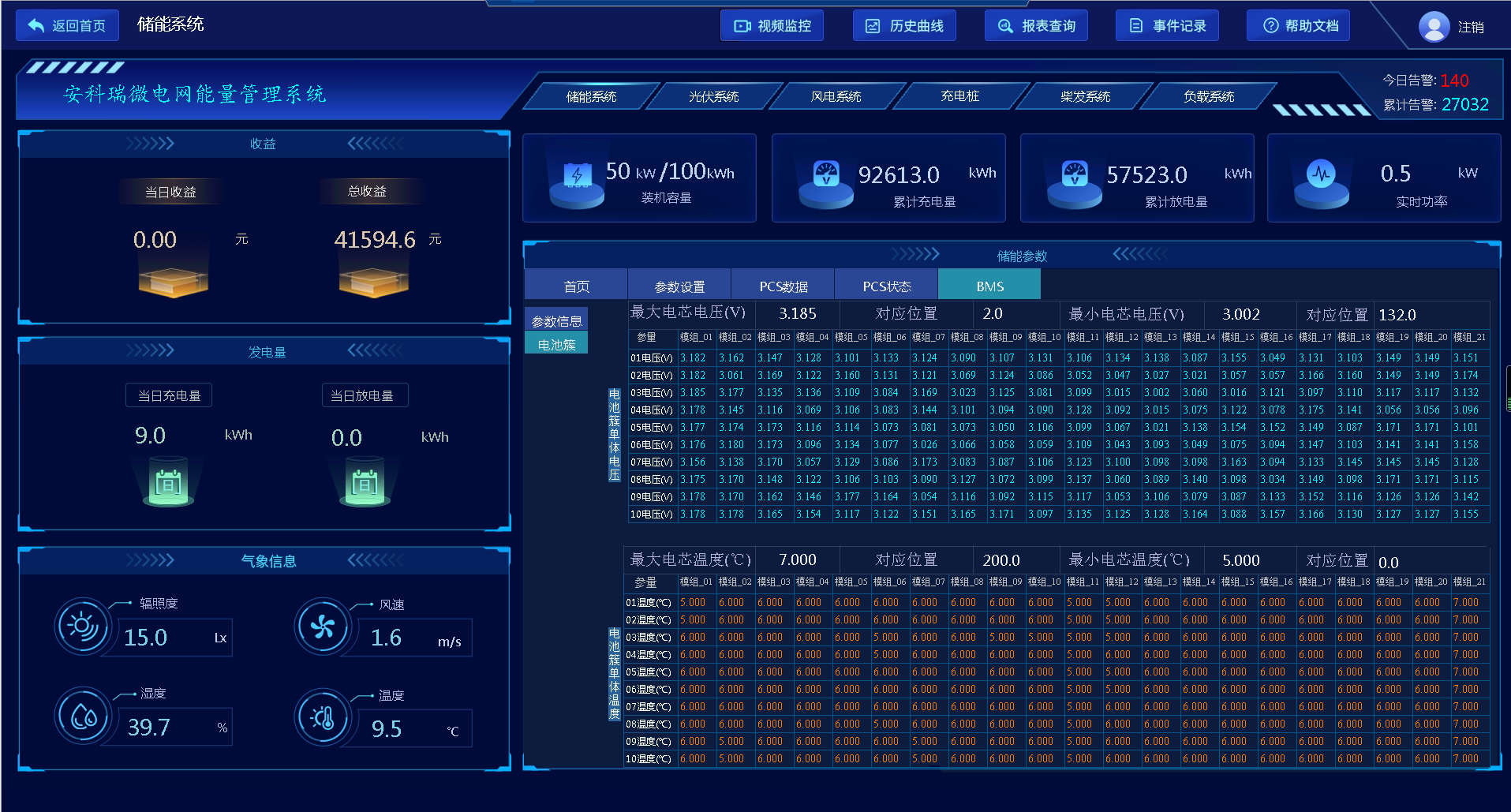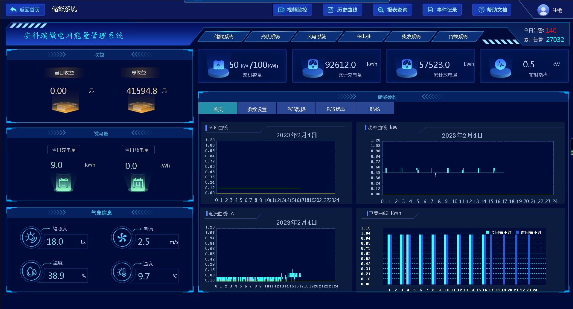 應(yīng)能夠?qū)b信變位,保護(hù)動(dòng)作、事故跳閘,以及電壓、電流、功率、功率因數(shù)、電芯溫度(鋰離子電池)、壓力(液流電池)、光照、風(fēng)速、氣壓越限等事件記錄進(jìn)行存儲(chǔ)和管理,方便用戶對(duì)系統(tǒng)事件和報(bào)警進(jìn)行歷史追溯,查詢統(tǒng)計(jì)、事故分析。