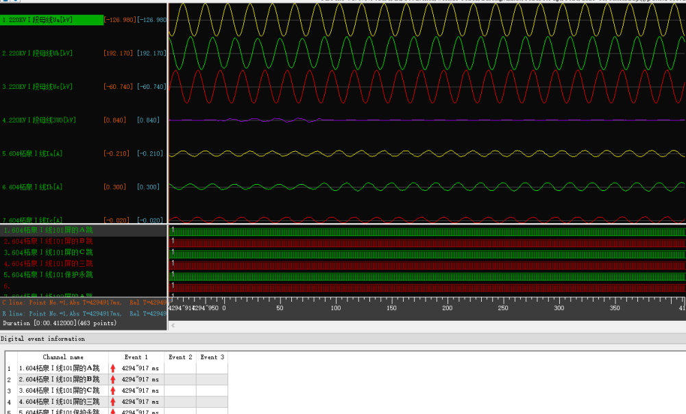 7)事件記錄查看功能:事件記錄應(yīng)包含事件名稱、狀態(tài)(動(dòng)作或返回)、波形號(hào)、越限值、故障持續(xù)時(shí)間、事件發(fā)生的時(shí)間。