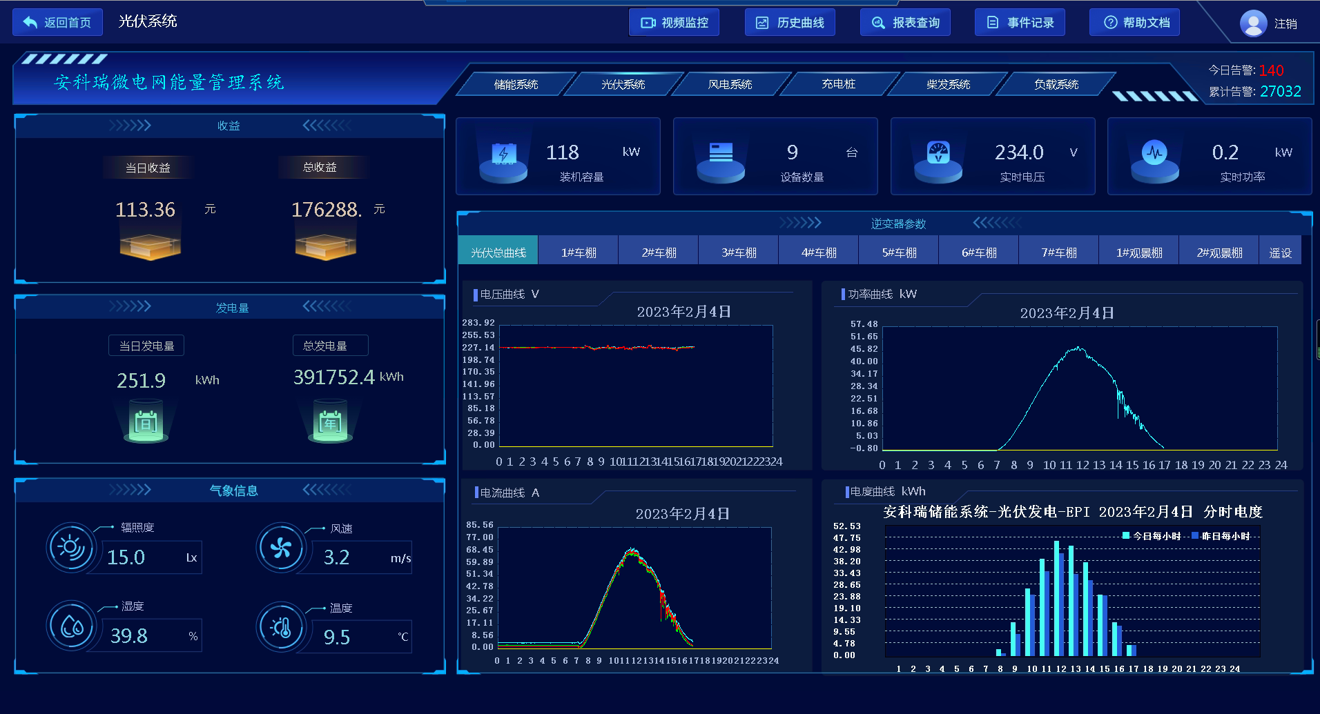 本界面用來(lái)展示對(duì)光伏系統(tǒng)信息,主要包括逆變器直流側(cè)、交流側(cè)運(yùn)行狀態(tài)監(jiān)測(cè)及報(bào)警、逆變器及電站發(fā)電量統(tǒng)計(jì)及分析、并網(wǎng)柜電力監(jiān)測(cè)及發(fā)電量統(tǒng)計(jì)、電站發(fā)電量年有效利用小時(shí)數(shù)統(tǒng)計(jì)、發(fā)電收益統(tǒng)計(jì)、碳減排統(tǒng)計(jì)、輻照度/風(fēng)力/環(huán)境溫濕度監(jiān)測(cè)、發(fā)電功率模擬及效率分析;同時(shí)對(duì)系統(tǒng)的總功率、電壓電流及各個(gè)逆變器的運(yùn)行數(shù)據(jù)進(jìn)行展示。