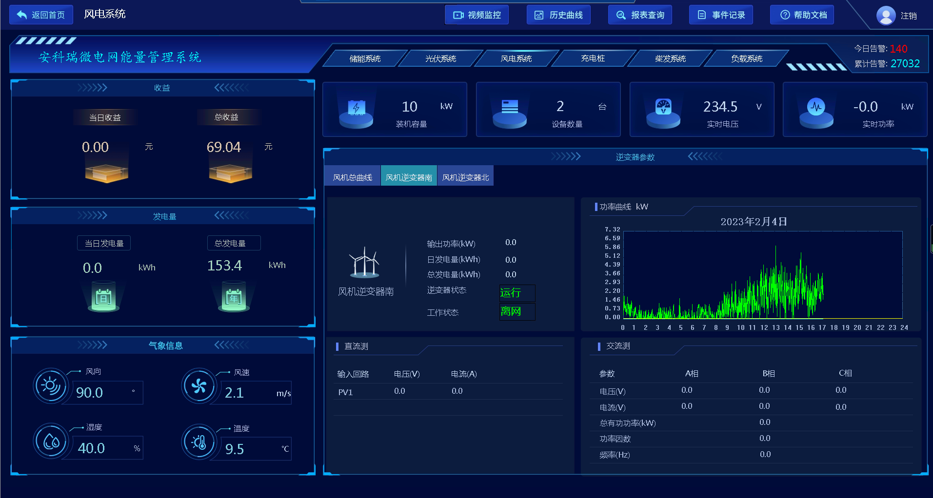 本界面用來(lái)展示對(duì)風(fēng)電系統(tǒng)信息,主要包括逆變控制一體機(jī)直流側(cè)、交流側(cè)運(yùn)行狀態(tài)監(jiān)測(cè)及報(bào)警、逆變器及電站發(fā)電量統(tǒng)計(jì)及分析、電站發(fā)電量年有效利用小時(shí)數(shù)統(tǒng)計(jì)、發(fā)電收益統(tǒng)計(jì)、碳減排統(tǒng)計(jì)、風(fēng)速/風(fēng)力/環(huán)境溫濕度監(jiān)測(cè)、發(fā)電功率模擬及效率分析;同時(shí)對(duì)系統(tǒng)的總功率、電壓電流及各個(gè)逆變器的運(yùn)行數(shù)據(jù)進(jìn)行展示。
